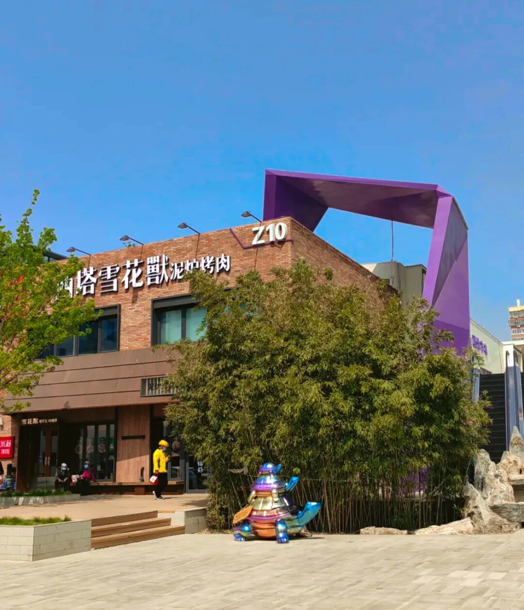 它最大的特色是大面积的紫色工业风建筑,在京城文创园里独树一帜。