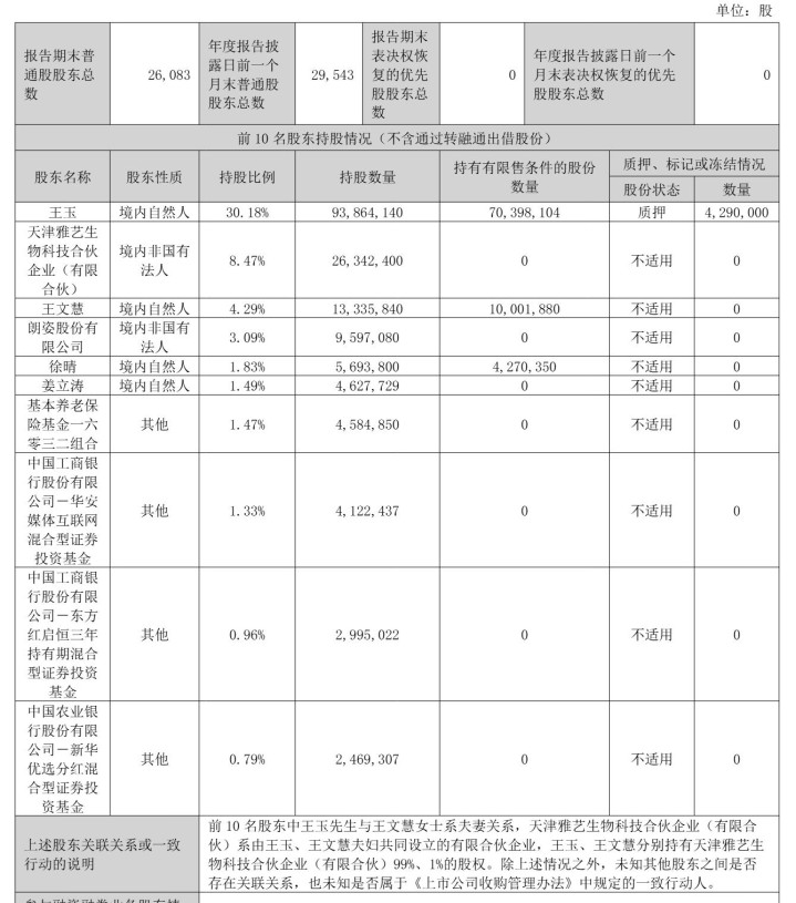 截至2025年12月31日,王玉持股为30.18%,天津雅艺生物科技合伙企业(有限合伙)持股为8.47%,王文慧持股为4.29%,朗姿股份有限公司持股为3.09%,徐晴持股为1.83%,姜立涛持股为1.49%;