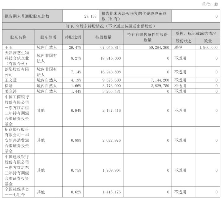 截至2025年6月30日,王玉持股为30.18%,天津雅艺生物科技合伙企业(有限合伙)持股为8.47%,朗姿股份有限公司持股为7.14%,王文慧持股为4.29%,徐晴持股为1.66%,姜立涛持股为1.44%;